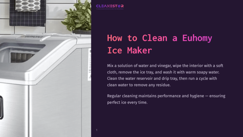 To clean a Euhomy ice maker, mix a solution of water and vinegar, wipe the interior with a soft cloth, remove the ice tray, and wash it with warm soapy water. Additionally, clean the water reservoir and drip tray, and run a cycle with clean water to remove any residue.