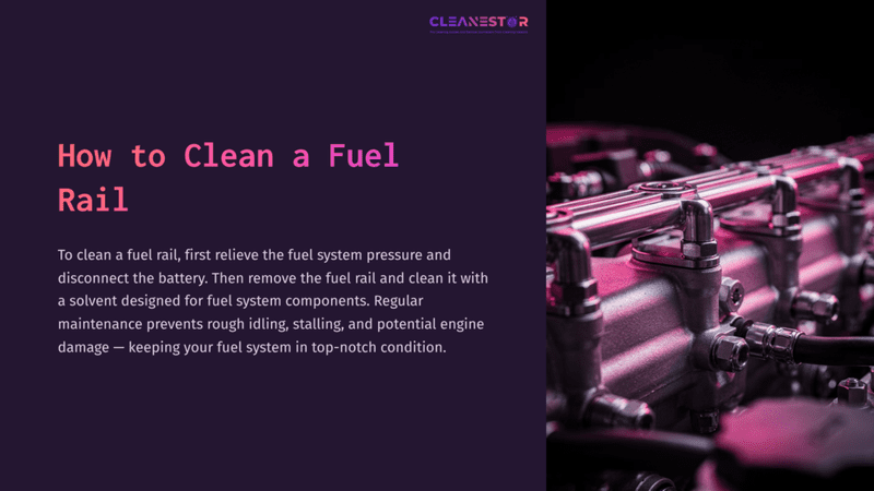 To clean a fuel rail, first relieve the fuel system pressure and disconnect the battery. Then remove the fuel rail and clean it with a solvent designed for fuel system components.