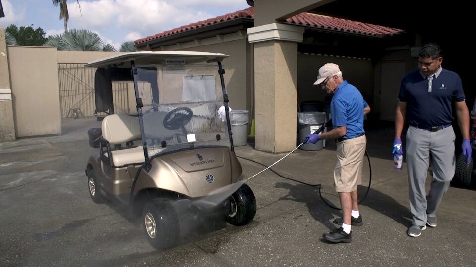 - Start by spraying the entire exterior of the golf cart to remove loose dirt and debris.
