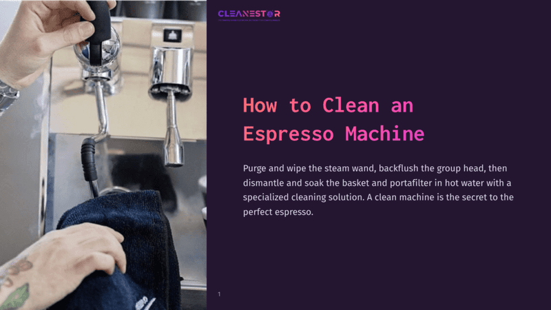 To clean an espresso machine, start by purging and wiping the steam wand, then backflush the group head. Dismantle and soak the basket and portafilter in hot water with a specialized cleaning solution.