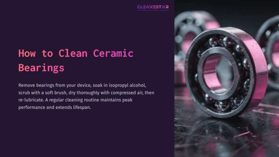 To clean ceramic bearings, remove them from your device and use isopropyl alcohol for soaking and a soft brush for scrubbing. Dry them thoroughly with compressed air or a clean cloth before re-lubricating.