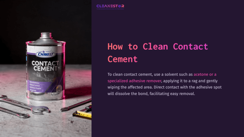 To clean contact cement, use a solvent such as acetone or a specialized adhesive remover, applying it to a rag and gently wiping the affected area. Direct contact with the adhesive spot should dissolve the bond, facilitating easy removal.