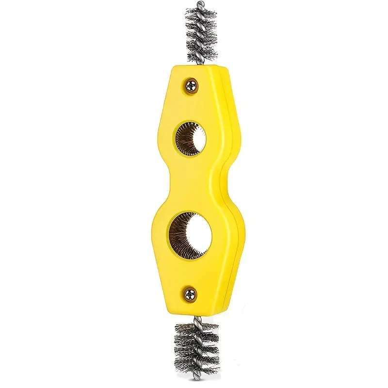 Yellow Wire Brush For Cleaning Copper Pipe Threads, Positioned On A Dark Purple Background With Instructional Text Above.