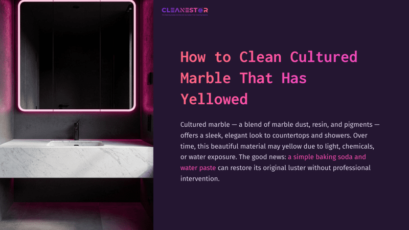 To clean yellowed cultured marble, use a blend of baking soda and water to make a paste. Apply the paste, let it sit for a few hours, then gently scrub and rinse off.