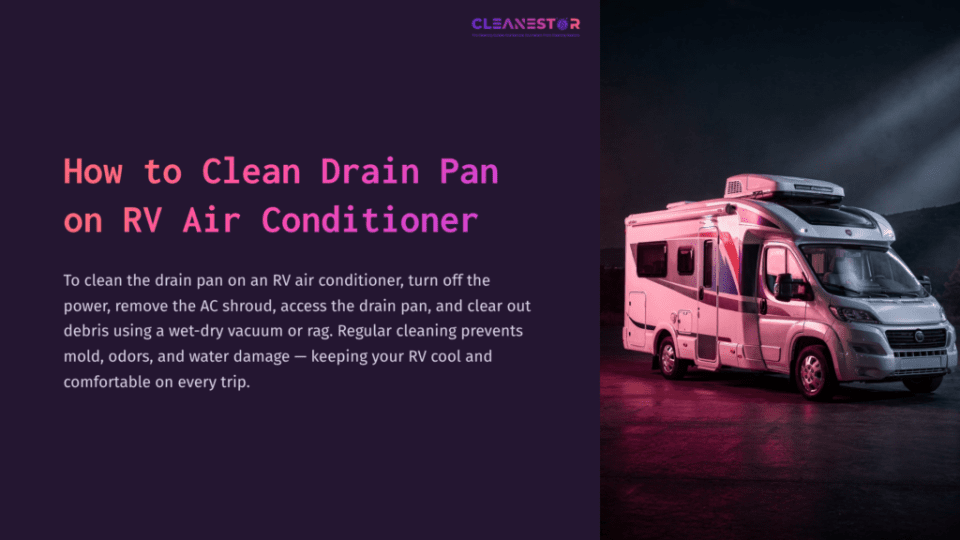 To clean the drain pan on an RV air conditioner, first turn off the power and remove the AC shroud. Next, access the drain pan and clear out any debris using a wet-dry vacuum or a rag.