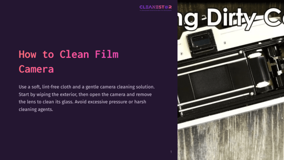 To clean a film camera, use a soft, lint-free cloth and a gentle camera cleaning solution. Start by wiping the exterior with the cloth, then open the camera and remove the lens to clean its glass. Avoid using excessive pressure or harsh cleaning agents.