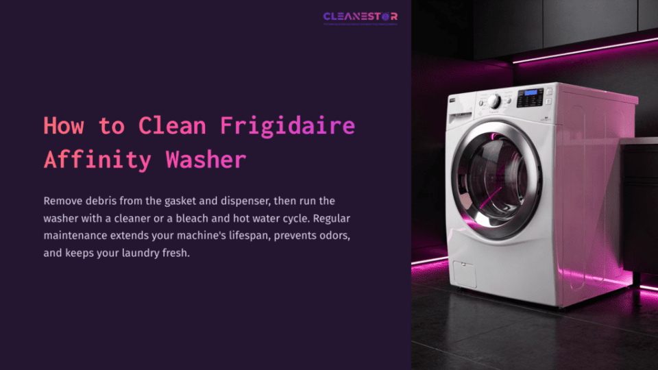 To clean a Frigidaire Affinity Washer, first remove any debris from the gasket and dispenser. Then, run the washer with a cleaner or a bleach and hot water cycle.