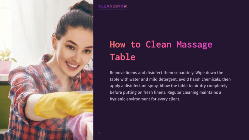 To clean a massage table, first remove any linens and disinfect them separately. Next, wipe down the table with a solution of water and mild detergent using a clean cloth. Avoid using harsh chemicals that could damage the tableโs surface. Dry the table thoroughly before applying a disinfectant spray to kill any remaining bacteria or viruses. Finally, allow the table to air dry completely before putting on fresh linens.