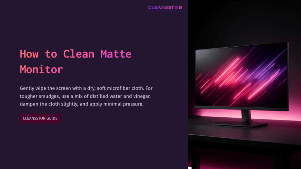 To clean a matte monitor, gently wipe the screen with a dry, soft microfiber cloth. For tougher smudges, use a mix of distilled water and vinegar, dampen the cloth slightly, and apply minimal pressure.