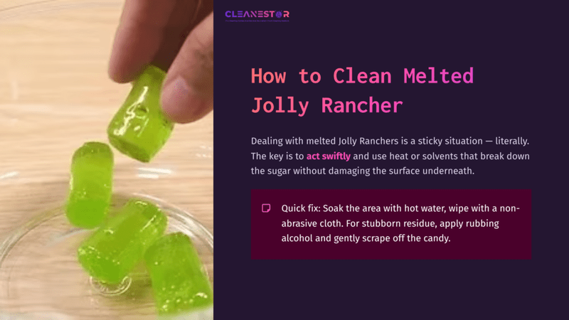 To clean melted Jolly Ranchers, quickly soak the area with hot water, then wipe with a non-abrasive cloth. For stubborn residue, apply rubbing alcohol and gently scrape off the candy.