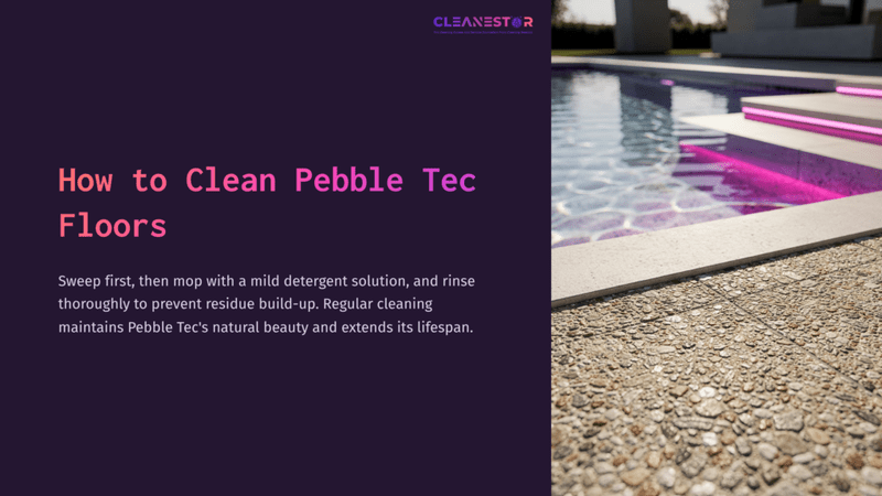 To clean a Pebble Tec floor, sweep it first, then mop using a mild detergent solution. Rinse thoroughly with water to prevent residue build-up.