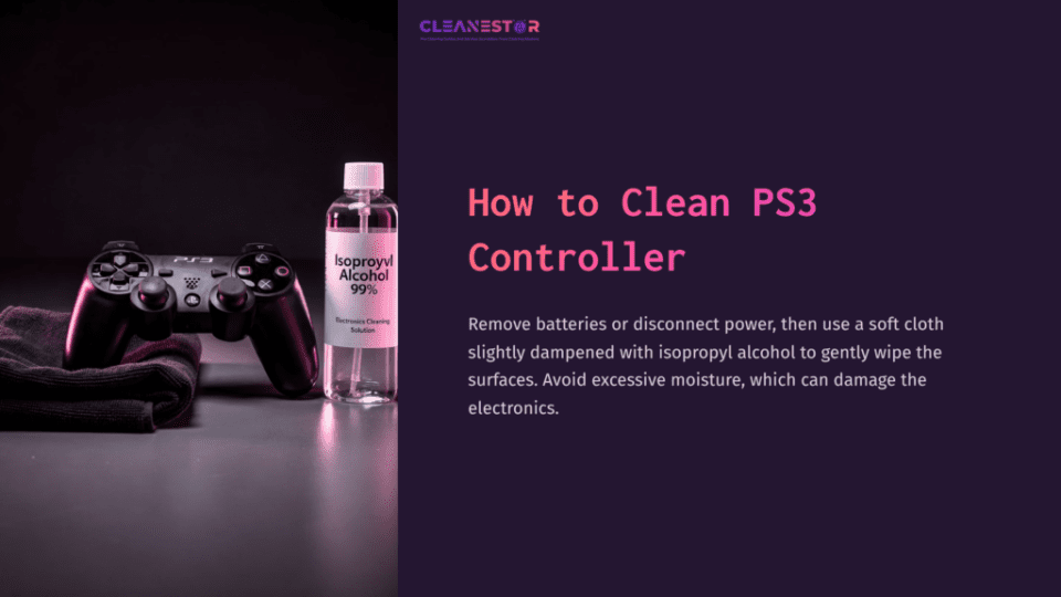 A Black Ps3 Controller Beside A Bottle Of Isopropyl Alcohol On A Purple Background, With Cleaning Instructions In White Text.