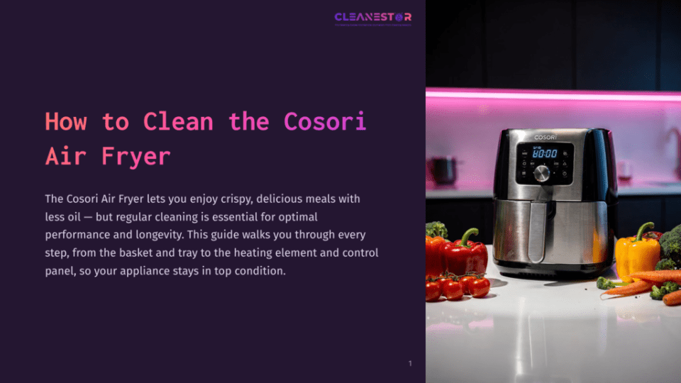To clean your Cosori air fryer toaster oven, first unplug it and let it cool down. Remove the accessories, such as the crumb tray and frying basket. Wash them using warm, soapy water and a soft cloth. Wipe the interior and exterior of the oven with a damp cloth. Dry all parts thoroughly before putting them back in place.