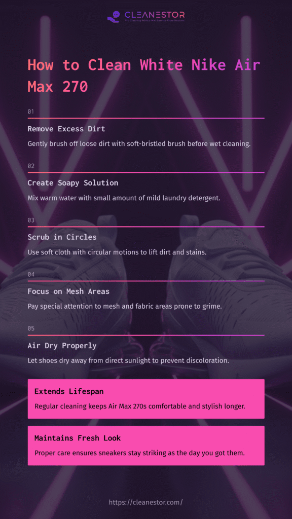 To clean White Nike Air Max 270s, remove excess dirt with a brush and wipe with a soapy solution. Use a soft cloth and circular motions for effective cleaning.