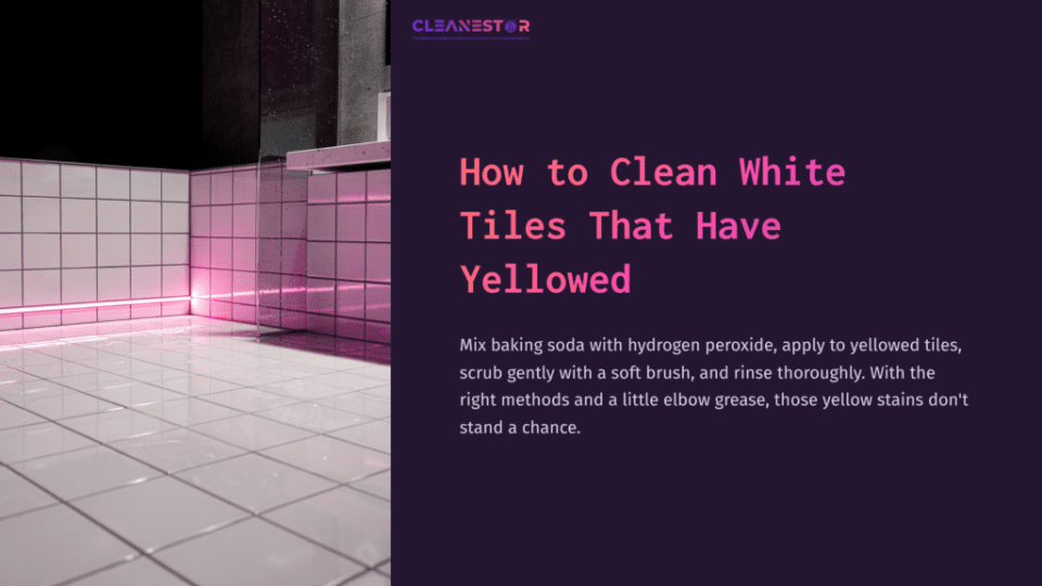 Mix a solution of baking soda and water to form a paste. Apply it to the yellowed tiles, scrub gently, then rinse clean. For stubborn stains, use diluted hydrogen peroxide, ensuring you wear gloves and rinse thoroughly afterward.